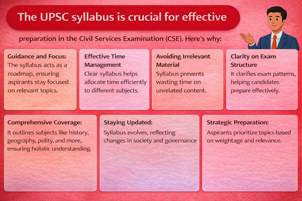 Understanding the UPSC Civil Services Prelims syllabus offers clear guidance and focus, helping aspirants study strategically, avoid irrelevant topics, and allocate time effectively. The syllabus acts as a roadmap, outlining specific topics to be covered and ensuring focused preparation.